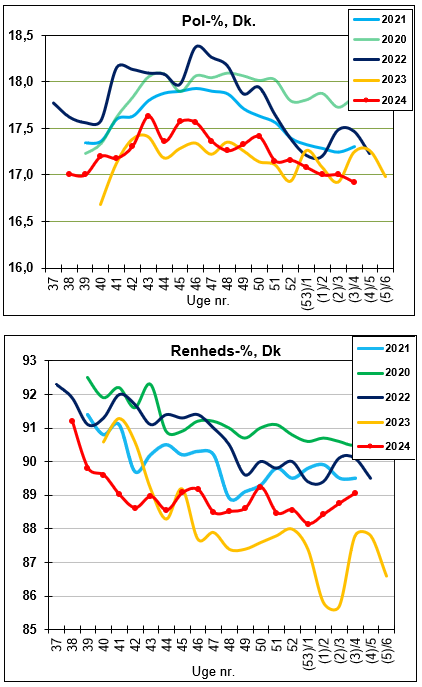 I nedenstående kurver vises pol-% og renheds-% for de sidste fem år.
