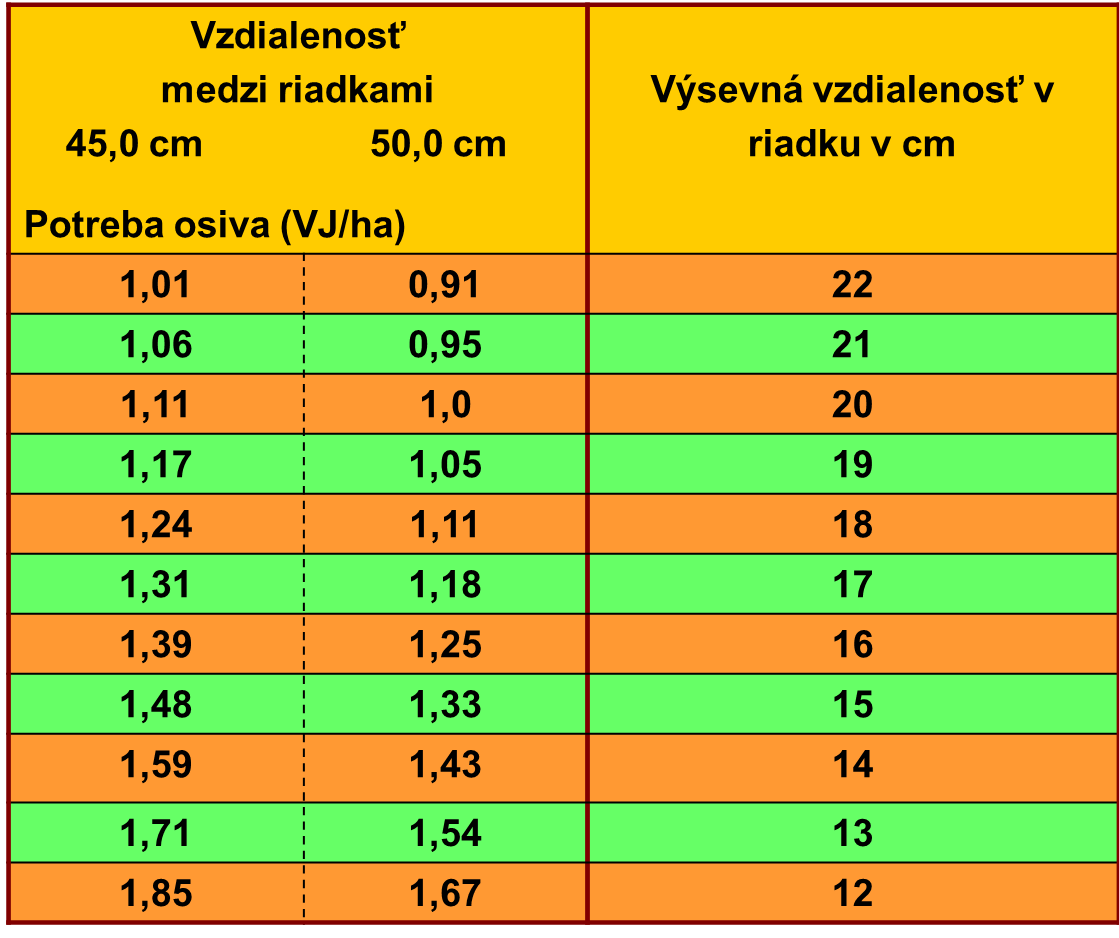 Vzdialenosť osiva v riadku zvoliť podľa dosahovanej poľnej vzchádzavosti a pružne podľa prevládajúcich podmienok.