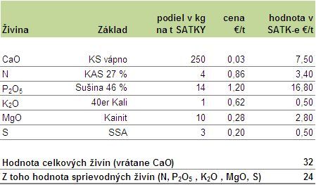 Ekonomické zhodnotenie obsahu živín v 1t SATKy: